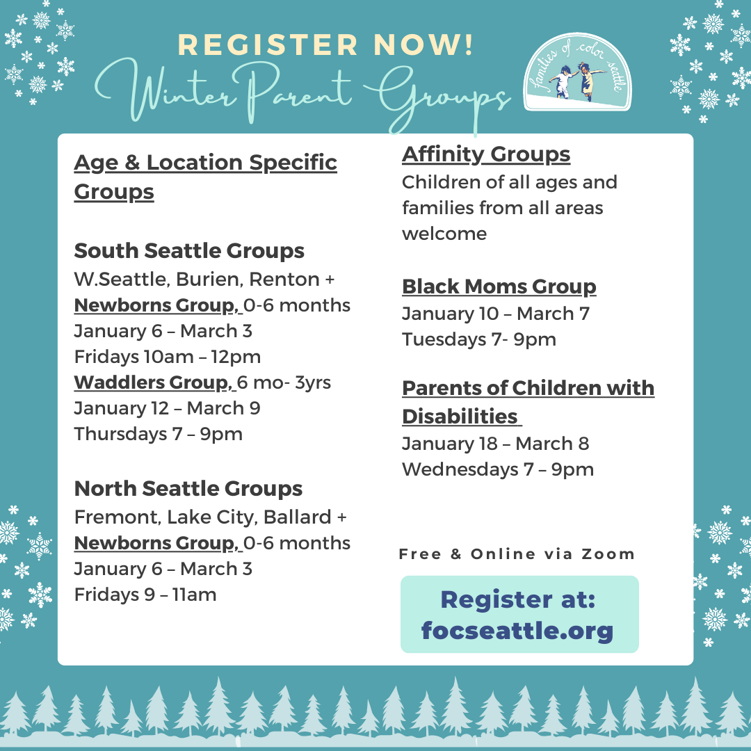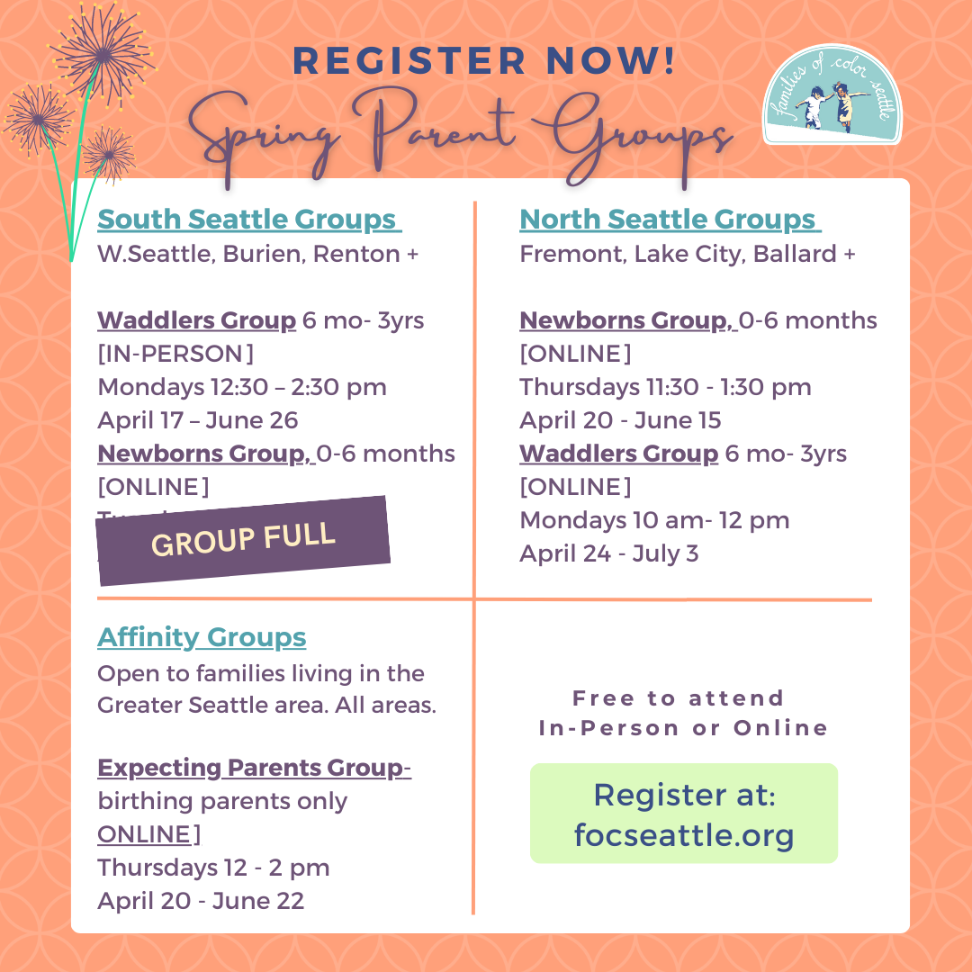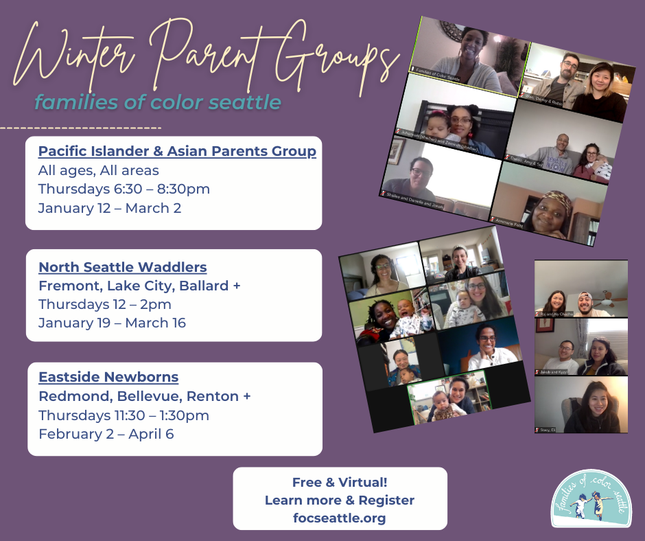 Peer-led parent support groups for families of color. Connect with other families through an eight to ten week cohort for newborns, waddlers, and affinity groups.